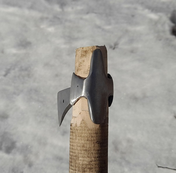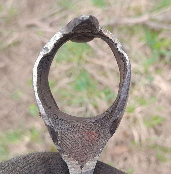 Фото чтобы не сомневались, что топор сделан без сварки из напильника шириной 35 мм и толщиной 7 мм. Диаметр проушины 35 мм.