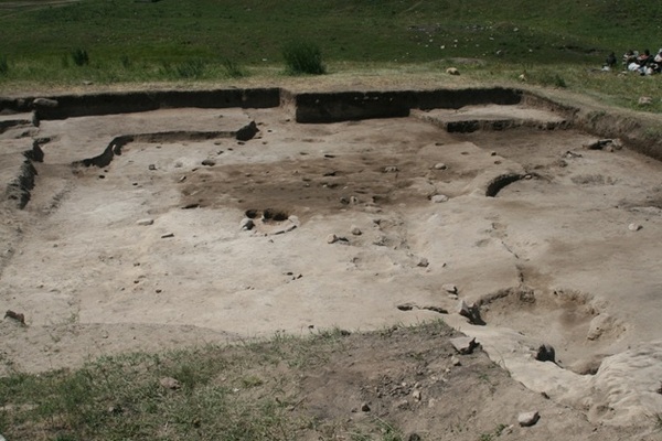 Вот в таком виде он предстал перед нами после раскопок. Это помещение прямоугольной формы каркасно-столбовой конструкции, размерами 13,5 х 9,5м. Для его устройства была выровнена площадка, частично врезанная в склон сопки.