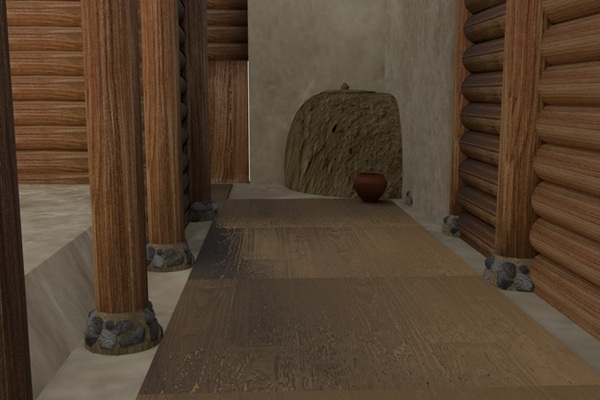 По периметру полуземлянки изнутри находились три коридорообразных помещения, шириной 1,6-1,8м каждое и длиной 8-9м. В северном углу два из них подходят к боковому выходу, к северу от которого располагались две крупные печи. От печей под полом помещения по периметру центральной части помещения зафиксированы воздухозаборные каналы - каны. Полы в боковых коридорах могли быть накрыты деревянными досками (отмечены повсеместные следы сгнившей древесной трухи). С одной стороны, такое покрытие накрывало эти каналы и позволяло теплому воздуху распространиться по всему периметру помещения, а с другой выравнивало поверхность самих коридоров.