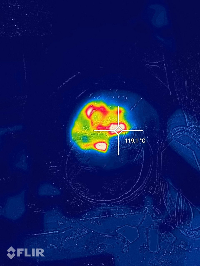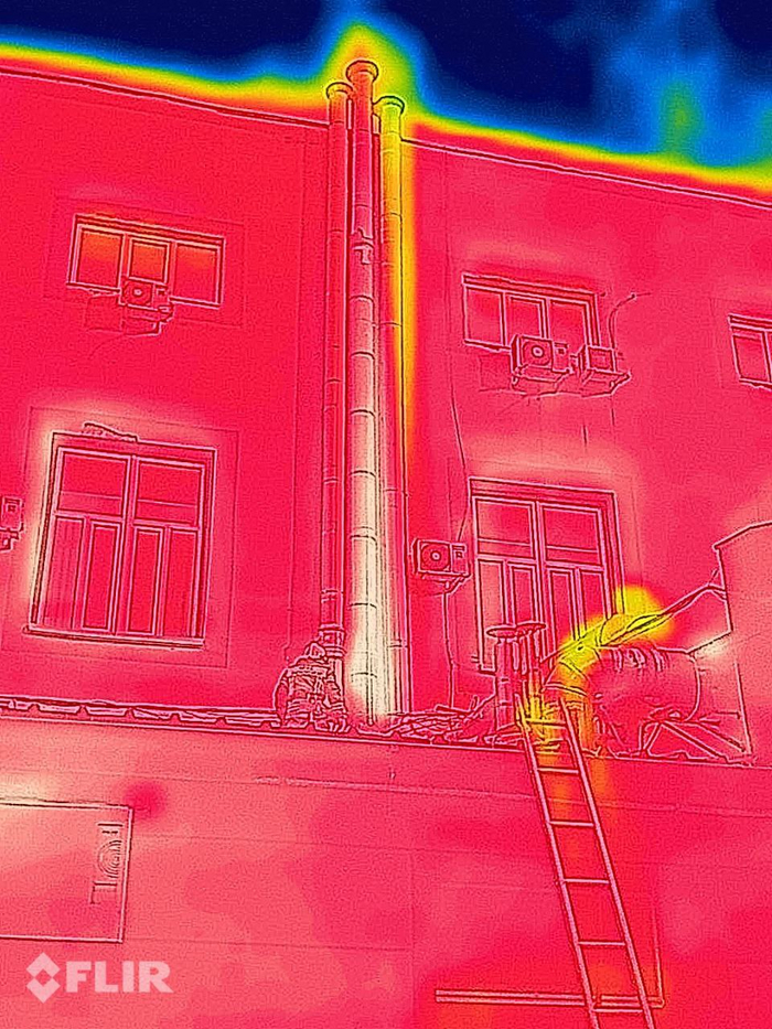 Для понимания температуры в дымоходе вот вам фото с тепловизора. Здесь пока что пожара не было, дровяной котёл топится в штатном режиме, при этом в колене температура больше 400 градусов, чего достаточно для воспламенения дерева. Еще раз повторюсь - если положить на трубу доску, она сама загорится. И будет гореть зажигая всё вокруг.