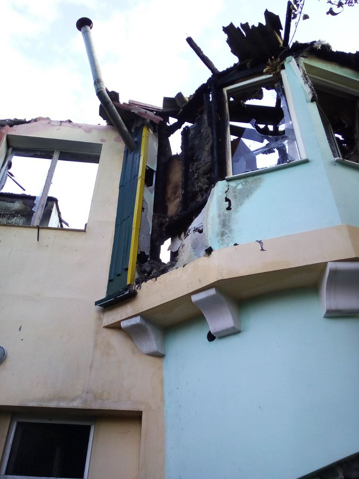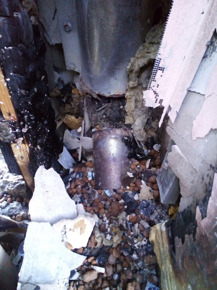 Здесь труба на стыке просто прогорела, и пожар возник прямо внутри стены. Результат на фото ниже.