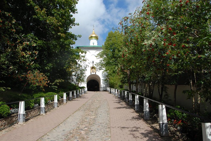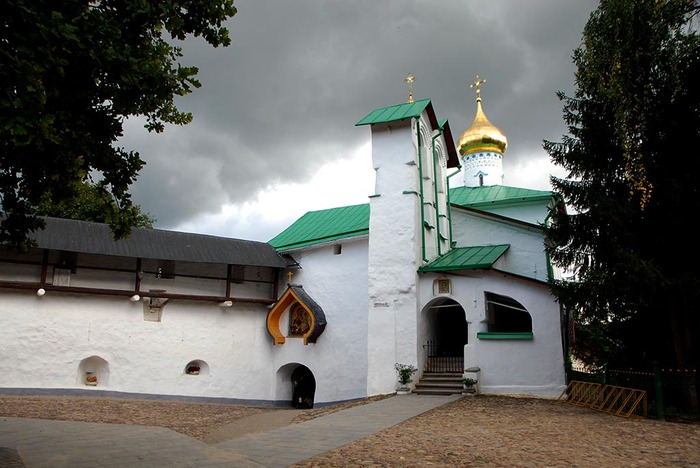 А вот если повернуть налево от входа, то тут уже интересно. Это Никольская церковь, поставленная еще самим Корнилием. Так называемая "надвратная церковь" - там внизу слева ворота на внутреннюю часть обители. В помещении ворот устроен небольшой церковный магазинчик. Пока через ворота идешь, настраиваешься, так сказать.