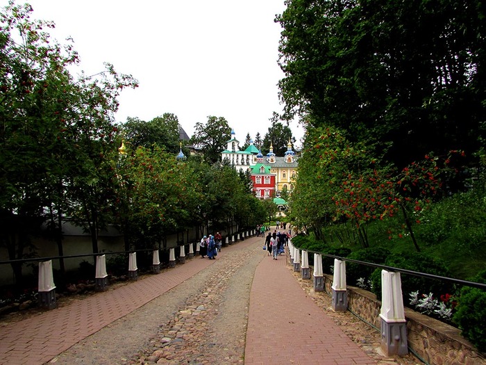 Внизу, меж холмами путника встречает благолепие. Честно говоря, несмотря на мое скептическое отношение к монастырям, интерьер монастырского двора очень душевный. Мне есть с чем сравнить, так как в наших краях с древнейших времен монастырь стоял на монастыре и монастырем погонял. И сейчас их тут куча, хочешь не хочешь, а все равно посетишь. И в Печорах, возможно, наиболее приятный глазу ландшафтный дизайн. Тут они молодцы, ага.