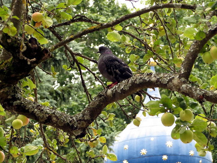Вот православный голубь сидит на яблоне и говорит: несите все ваши деньги мир вам, паломники! Там на спуске на обочине стоит карета Анны Иоановны, настоящая. То есть тут еще и экспонаты исторические, а не только голуби. Сфоткать карету не получается - она за стеклом, и стекло это безбожно бликует.