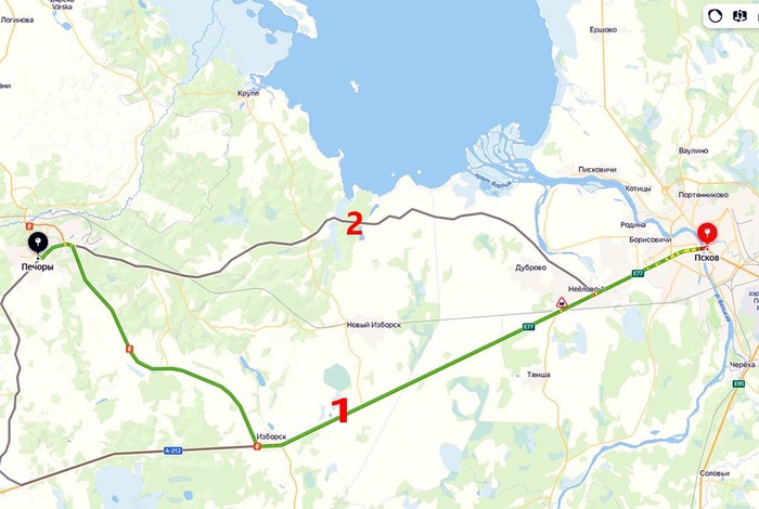 Что касается дороги. От Пскова до Печор - 60 км. Дорога удовлетворительная. Есть два варианта поездки. Первая - см. карту - это короткий путь. Подойдет для тех, кто собирается посетить Изборскую крепость (про нее несколько постов в нашем сообществе). Часть дороги от Изборска до Печор - платная. Но я ни разу не видел, чтобы там взимали плату. Скорее всего это для тех, кто пересекает границу, ведь в Печорах находится таможенный терминал - город на самой границе с Эстонией. Второй вариант пути - по очень вертлявой дороге (псковичи называют ее "пьяная дорога"). Но она интересна тем, что по пути встречаются очень красивые лесные пейзажи на холмах и даже есть участок с видом на Псковское озеро. Осторожно: в некоторых местах могут стоять пограничники, проверять документы и спрашивать, куда намылились. Еще в окрестностях - куча баз отдыха разной ценовой категории, имейте в виду.