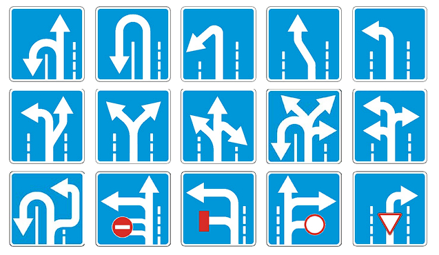 Знаки направлений движения по полосам (5.15.1. и 5.15.2.) и так отличаются своим разнообразием. Но в данном документе это разнообразие было возведено в абсолют. Так и подмывает спросить — в незнакомом городе, ночью, да еще и в туман — они точно мне помогут? Или я просто брошу машину посреди перекрестка и пойду пешком? А вам как? Стало легче?