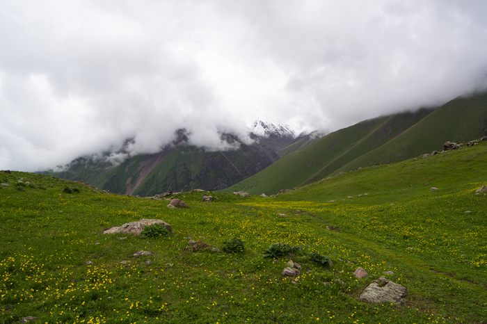 Облака живописно наползали и отступали. Взяв нахрапом очередной резкий подъем, я офигела от увиденного... Какой-то другой мир. Всю дорогу меня восхищали виды, но тут я просто дар речи потеряла.
