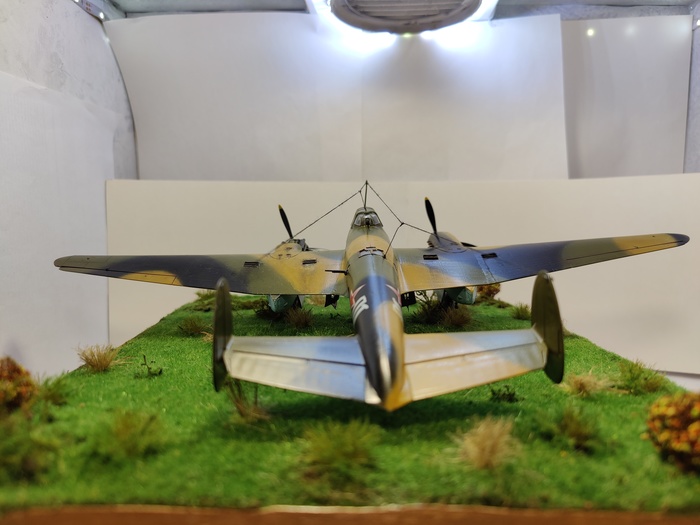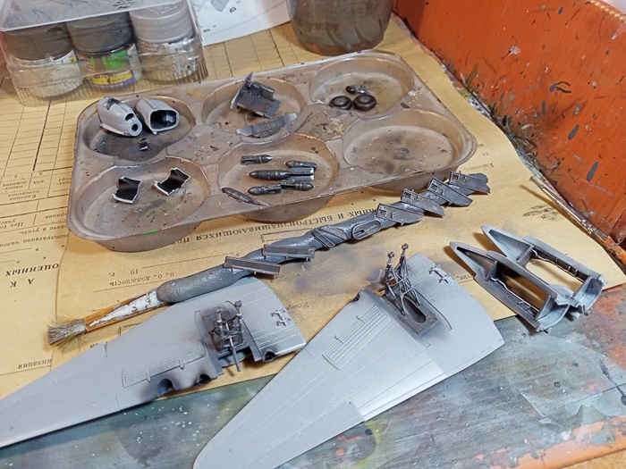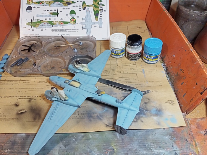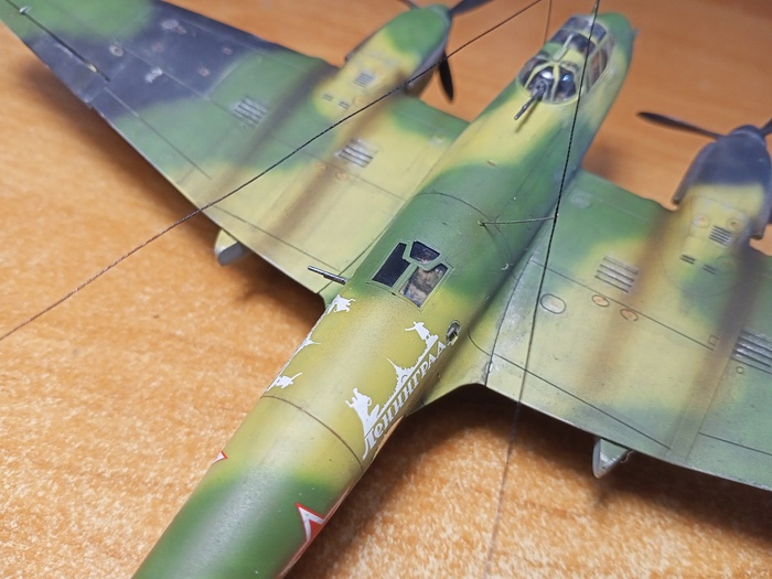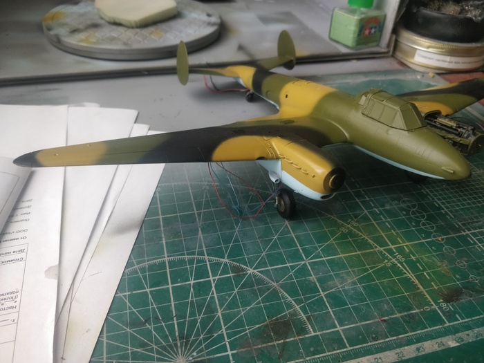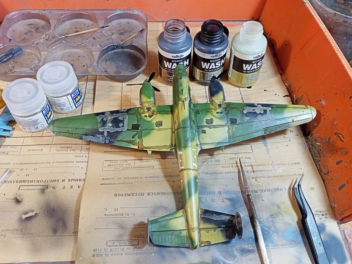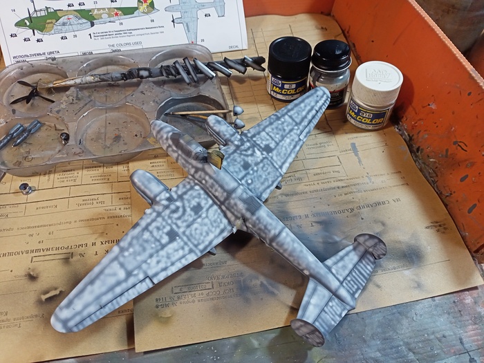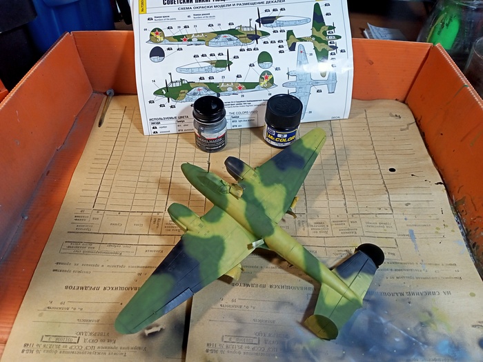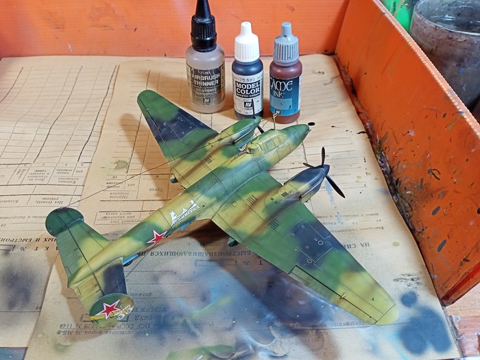 Тёмно-серый намешан почти чёрным, ибо есть опыт покраски подобного камуфляжа на Ил-2, который я запорол, сделав слишком светлый серый. Затем кистью покрашены выхлопные коллекторы, стволики пулемётов и габаритные огни. Самолёт задут глянцевым эмалевым лаком.