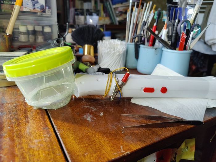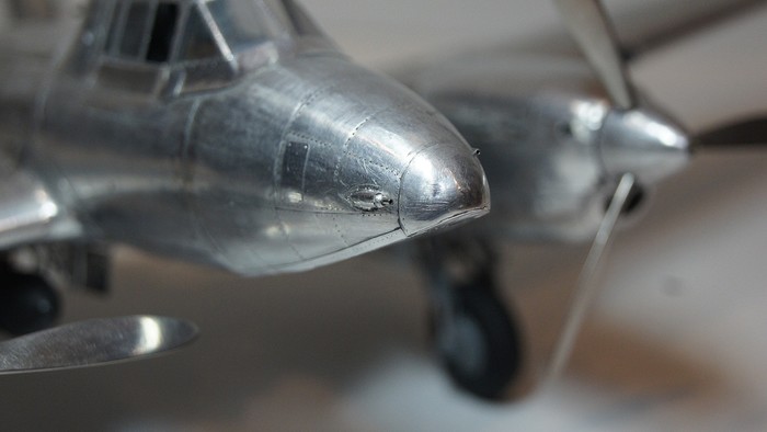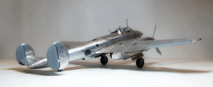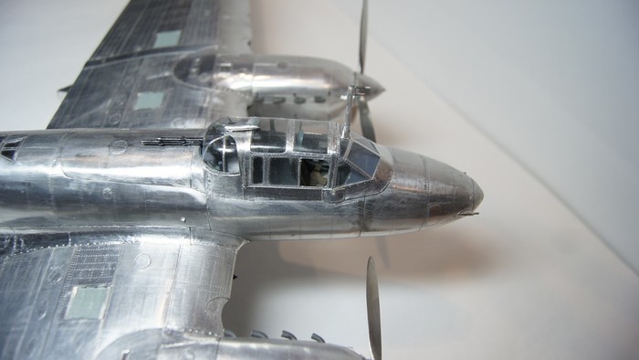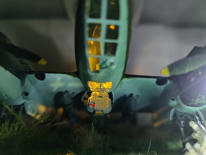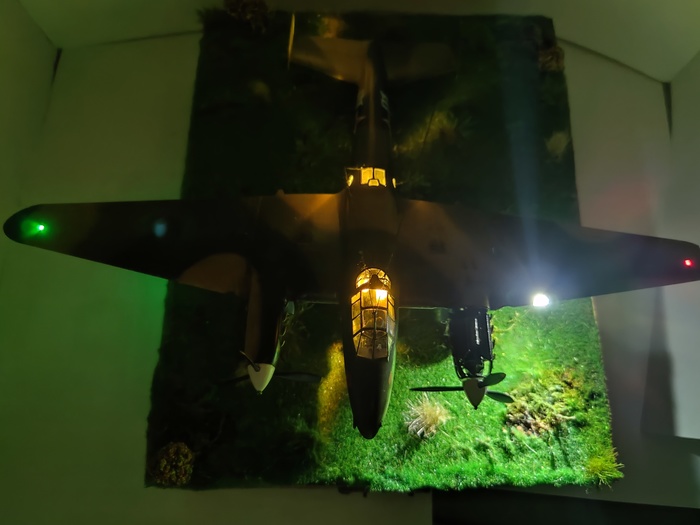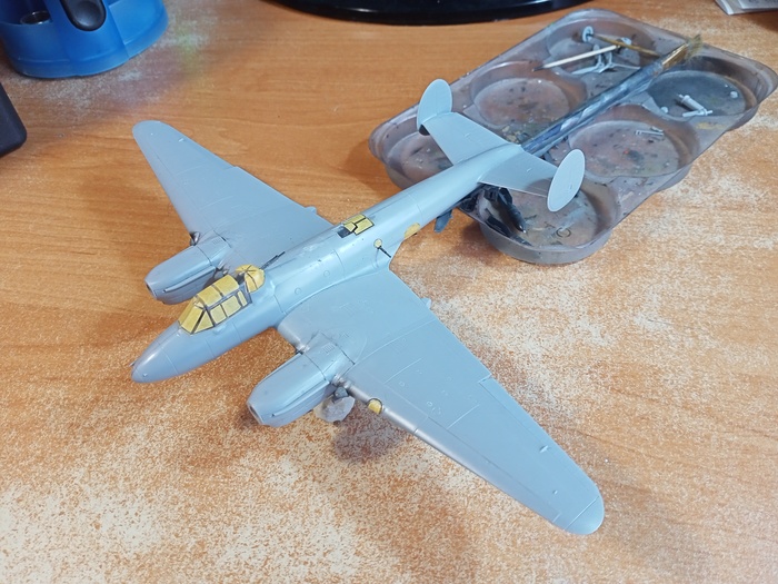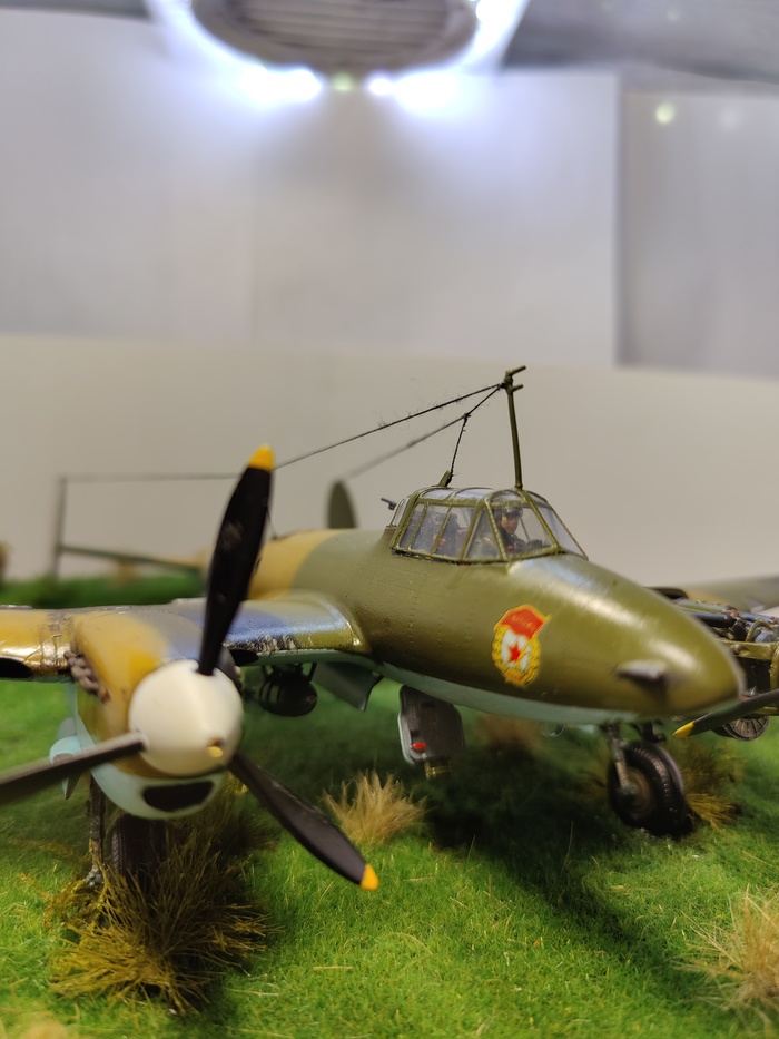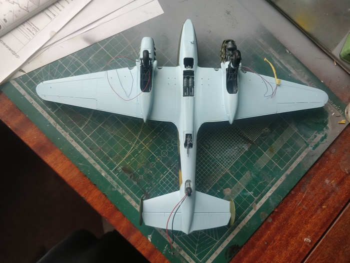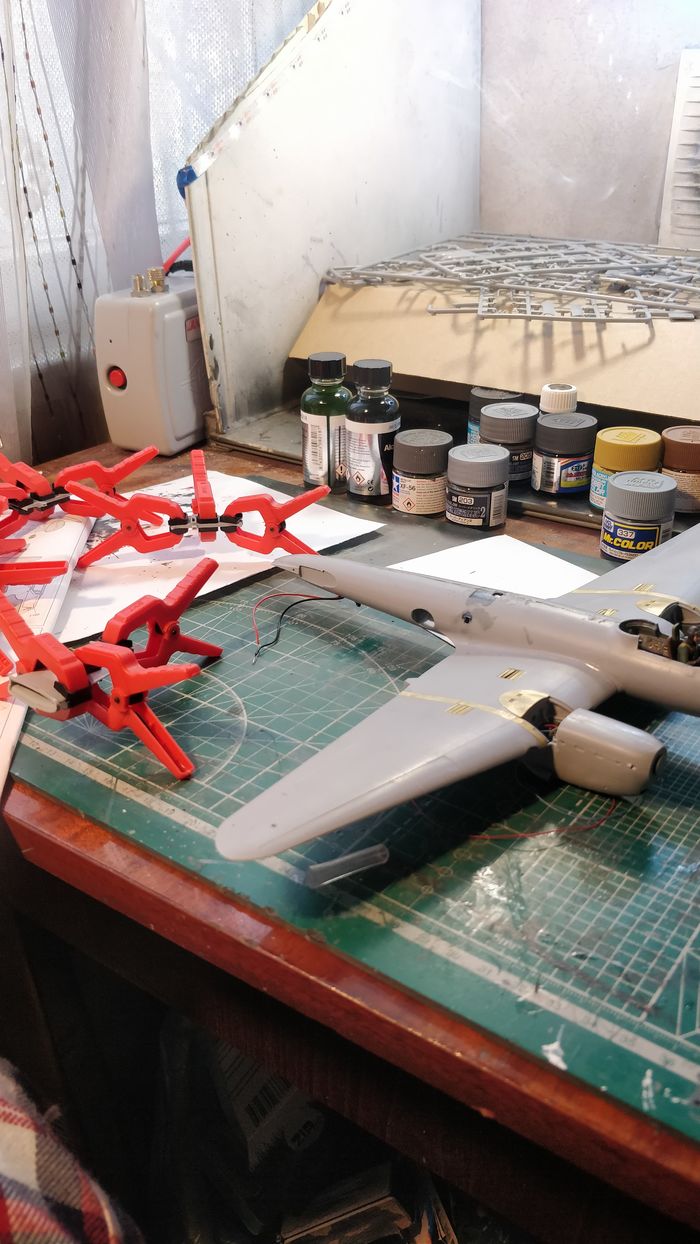 Тёмно-серый намешан почти чёрным, ибо есть опыт покраски подобного камуфляжа на Ил-2, который я запорол, сделав слишком светлый серый. Затем кистью покрашены выхлопные коллекторы, стволики пулемётов и габаритные огни. Самолёт задут глянцевым эмалевым лаком.