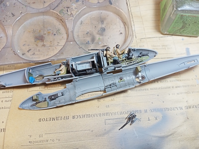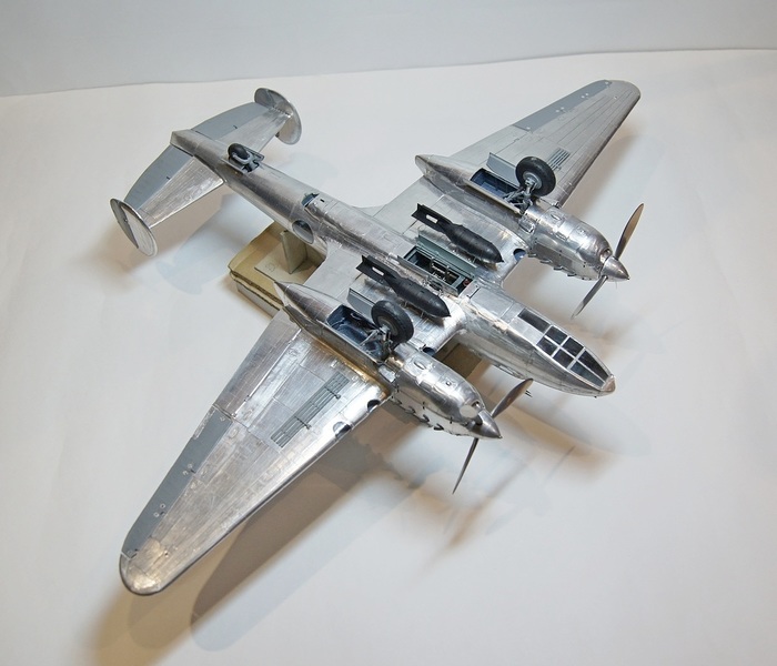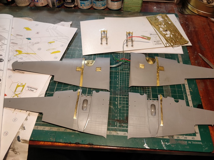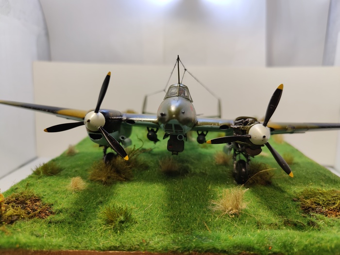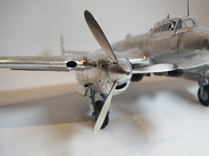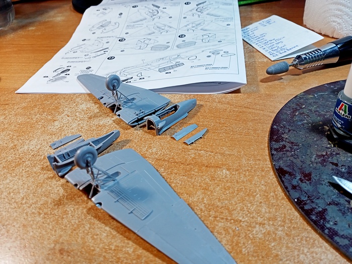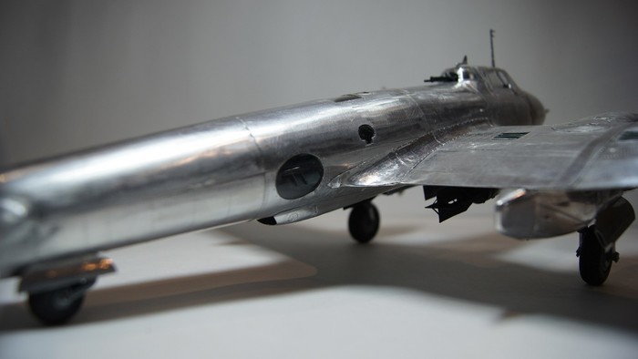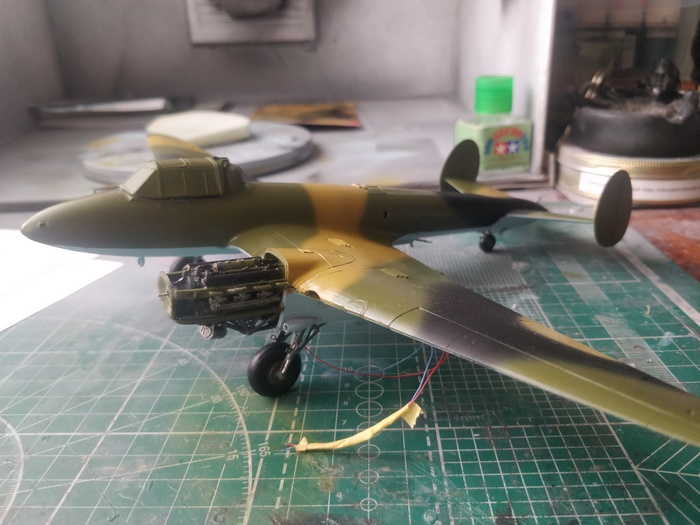 О создании: Сборка, как это ни странно, начинается не с интерьера, а с крыльев. Уже второй набор от "Звезды", где такое нестандартное решение - первый был Bf.109F-2. Зачистка деталей скальпелем, пилками, фрезером, склейка сверхтекучим и обычным модельным клеем. В целом разделил работу над моделью на три этапа сборки и покраски - сначала шасси, начинка гондол и бомбового отсека, затем интерьер фюзеляжа и экипаж, и в конце экстерьер. Как видим по фото, детализация стоек шасси подкупает.