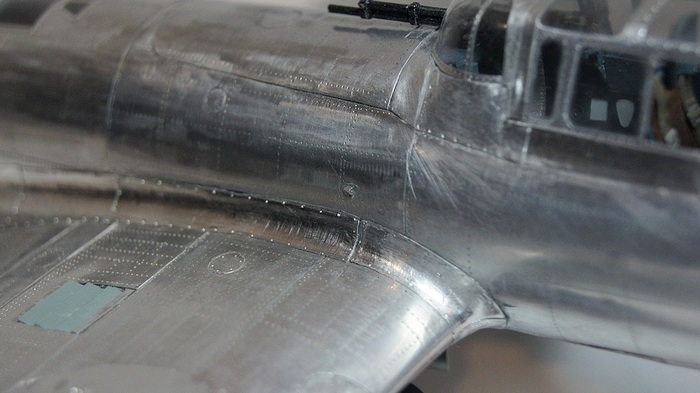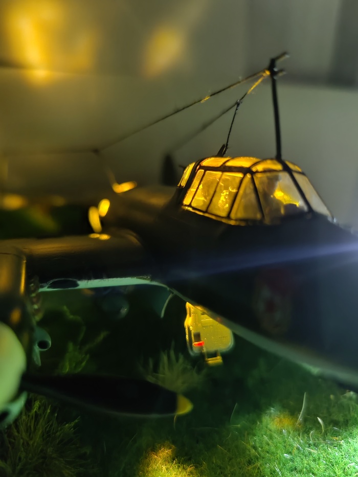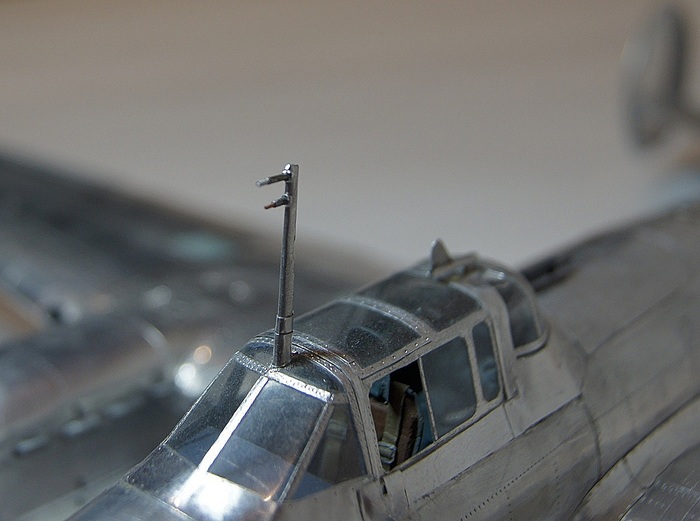 Следующий этап потрепал нервов больше, чем покраска интерьера и камуфляжа вместе взятые. Пресловутые антеннки, будь они неладны! Дело в том, что их две, идут от мачты на фонаре кабины к килям. А мачта - очень тоненькая пластмассочка, которая не выдерживает натяжения и сгибается... Пытался приклеить тоненькие волокна из шторки, как на Мессере 109 - не получилось, мачта не выдержала даже одной нити. Попробовал приклеить струну от электрогитары, как делал раньше. Тоже ерунда, струна имеет свою кривизну и на такой длине (13 см) он очень бросается в глаза. В итоге приклеена многократно проверенная чёрная нить. в комбинации с кусочками струны в качестве подпорок. Не идеально, не очень масштабно, но лучше у меня не получилось.