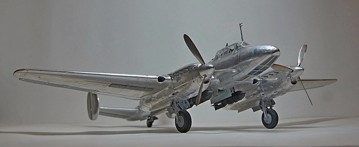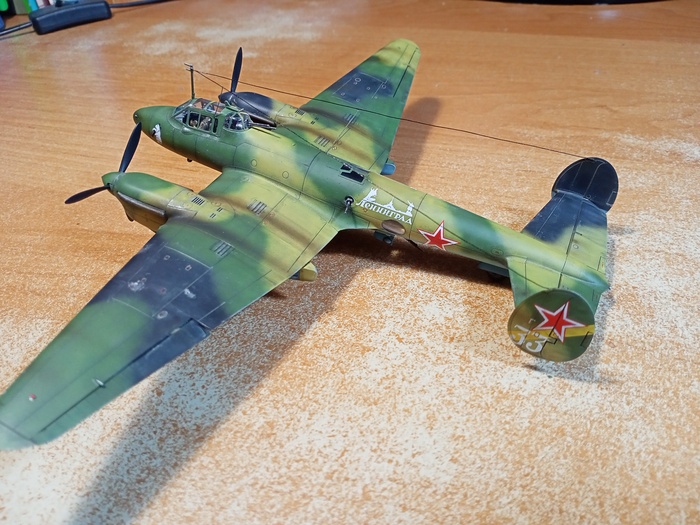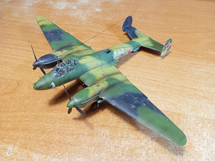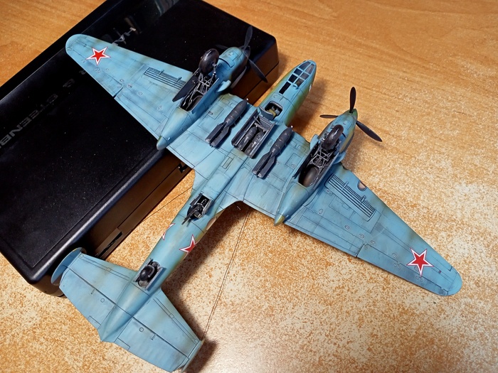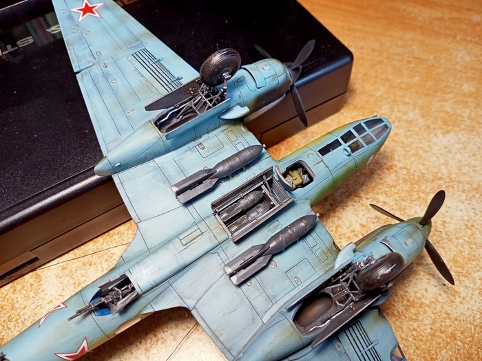 О наборе: Свежий набор 2019 года разработки от российского производителя Звезда. В коробке среднего размера лежат четыре литника из серого полистирола, один из прозрачного с остеклением, декаль и инструкция. Набор состоит из 199 деталей, и такое большое количество для 72 масштаба объясняется наличием в модели частичного интерьера. Неиспользованными останутся около десятка деталей. Качество литья в целом очень хорошее, но есть пара нюансов - в моём наборе обе половинки фюзеляжа в районе верхнего шва имели небольшой недолив, который при стыковке давал заметную вмятину; также были замечены небольшие участки облоя на хвостовом оперении; ну и неизбежные следы стыковки половин пресс-формы, без них никуда. Пластик обычный современный звездовский. Детализация от хорошей до превосходной. Снаружи имеем тонкие антенки, стволики пулемётов, прекрасно проработанное сложное шасси с нишами, показан рельеф полотняной обтяжки элеронов и рулей. Внутри всё ещё лучше: кресла, пулемёты с патронными ящиками и лентами, радиостанция, приборы, бомбы в бомболюке... Расшивка внутренняя и вполне неплохая, несколько упрощённая - рядов заклёпок нет, но есть много лючков и решёточек; работать с расшивкой комфортно. Стыкуемость в основном близка к идеальной, хотя есть некоторые моменты в интерьере и с передней частью мотогондол, но мне они не доставили хлопот. Прозрачные детали хорошего качества - тонкие, чистые, с удобным переплётом. В наборе умеренная вариативность - для начала выбираем летящий самолёт с закрытыми люками либо стоящий на земле. Затем решаем, какую из предложенных исторических машин будем делать, и выбираем выхлопные коллекторы или реактивные патрубки; остекление стрелка-радиста с одним или двумя козырьками и тип бомбовой нагрузки (хотя тут всё довольно скромно: два центропланных держателя и на них две ОФАБ-250 и четыре ФАБ-100 в бомбоотсеке). В комплекте три фигуры членов экипажа, они очень хорошо проработаны и состоят из 4-5 деталей каждая! Инструкция стандартная звездовская нового типа, всё просто, наглядно и понятно. Отдельно есть схема расположения технических надписей, что очень помогает. Схемы окраски на отдельном цветном вкладыше, демонстрируют самолёт со всех необходимых ракурсов. Предлагаются целых пять вариантов: польский с однотонным зелёным верхом и четыре советских с трёхцветным камуфляжем, но различным расположением пятен, и конечно же с разной маркировкой. Все борты интересные и яркие - на одном надпись "Забияка", на другом "За Бориса Сафонова!" и белые сердечки, на третьем "Ленинград" с белым медведем, а четвёртый со знаками гвардии на носу. Польский кстати тоже интересный, с красной стрелой на носу и полосами на килях. Декаль хорошая, яркая, легко садится в расшивку, подложка не слишком большая. А главное - в наборе достаточно подробно представлена техничка - надписи "не браться", "не становиться", "детонаторы вложены" и прочее. Они очень оживляют готовую модель - те самые прекрасные мелочи. Стоит указать и на очень невысокую цену - за такие же деньги наборы от импортных производителей будут на порядок хуже. За очень редкими исключениями. В качестве итога могу порекомендовать модель абсолютно всем моделистам, разве что кроме самых новичков. Интерьер не так страшен в работе и при окраске, как кажется на первый взгляд, а в целом хорошая с