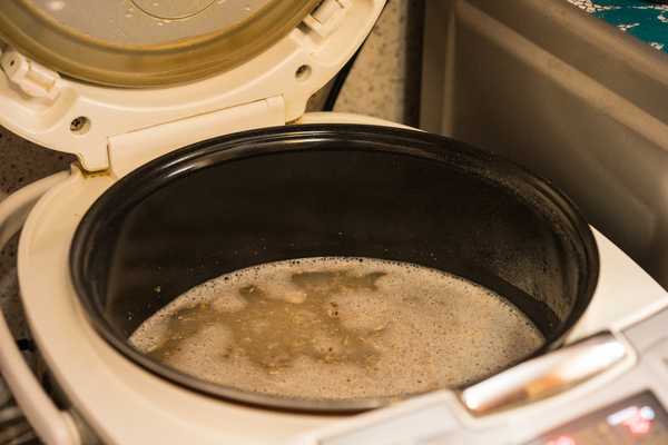Сухой у нас 600гр смеси, умножаем на 3, значит нужно налить 1800мл воды. Засыпали смесь солода и пшена, залили 1.8л водой 70 градусов и запустили. Вот так это выглядит в мультиварке с емкостью на 4л: