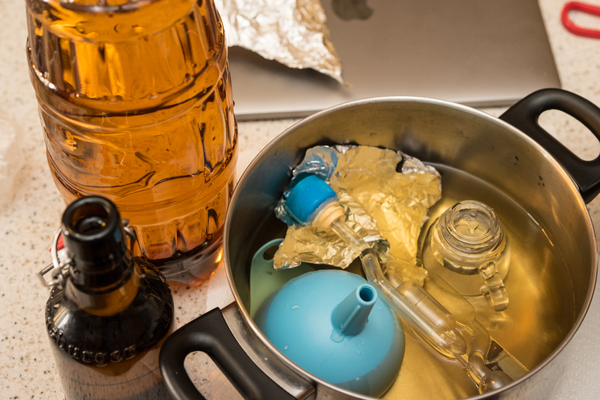 И конечно же стерилизуем всё что будет контактировать с суслом. Бутылочка для праймера, сиська-бродилка, воронка, кружечка разбраживания с фольгой и гидрозатвор интегрированный в крышку. Я делаю раствор йода с водой. Заливаю в бутылки и кастрюльку и оставляю подумать о своей судьбе. Если любите жить опасно, то чулок и толкушка для апельсина тоже должна быть стерильна, позже скажу почему.