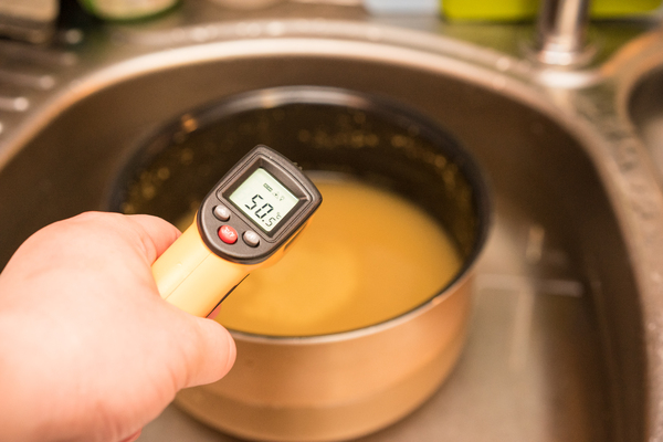 Теперь ставим емкость в раковину с ледяной водой и осторожно проточной водой поддерживая температуру снаружи емкости стремительно остужаем сусло до комнатной. Важно не брызнуть в сусло и не залезть в него рукой. Очень аккуратно всё делаем. Контролируем остывание.