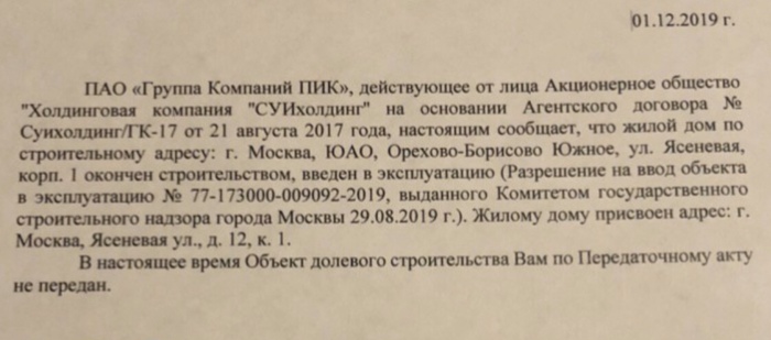 Несмотря на это, 30-го ноября я и мои будущие соседи поехали в офис заселения, чтобы получить официальное уведомление о переносе сроков. Нам конечно-же ничего не дали. Сказали, что у них нет полномочий и предложили написать заявление на получение уведомления. Вот такое уведомления я в итоге получил: