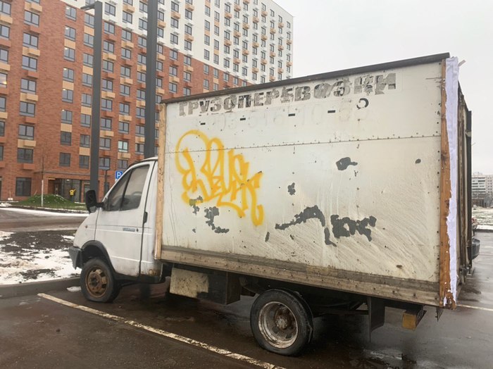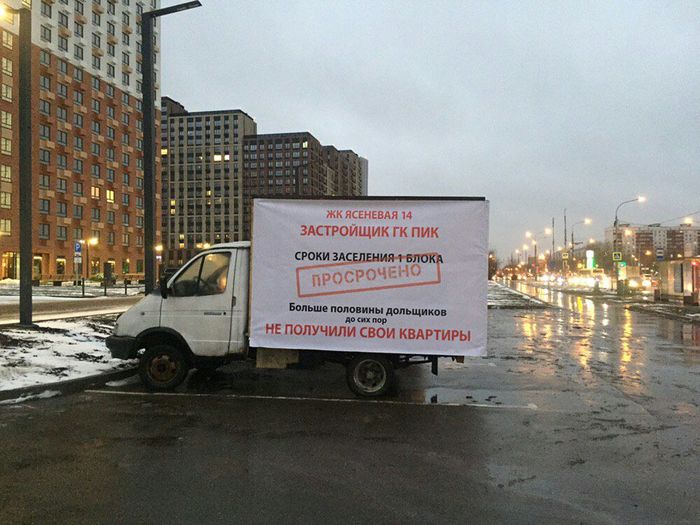 Немного офигев от наглости ПИК и его нежелания как либо ускорять отделочные работы инициативная группа жильцов установила около офиса продаж газель.