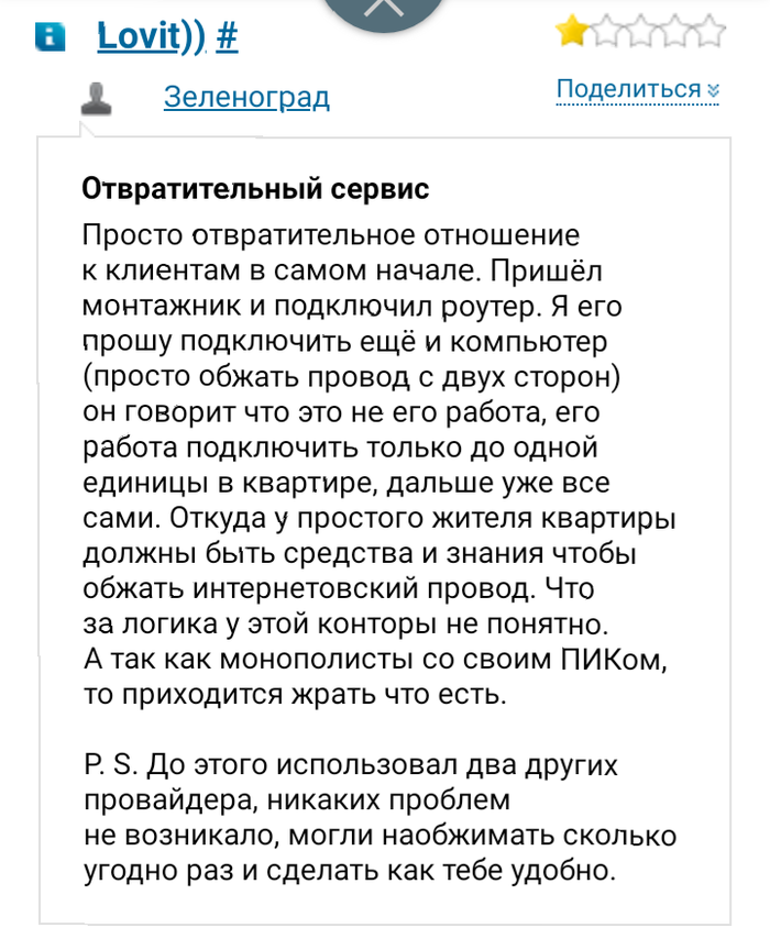 Вместе с жильём мы получили УК ПИК-комфорт, в которой от комфорта только название и невозможность выбрать провайдера. Есть только Lovit, который нехрена не ловит, а он является негласным провайдером ПИКа, а другие провайдеры не могут получить доступ, так как управляющая компания не позволяет.
