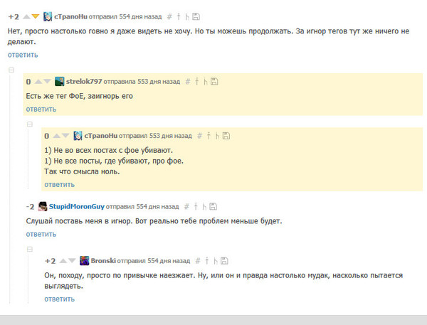 Мдаааааа. Эталон человеколюбия. По идее тут я должен был показывать коммент современного страпони, где таких перлов явно не увидите. И это должно было быть первым доказательством, что страпони не страпони. Однако позже я понял, почему я вижу меньше хейта со стороны страпони. Он на меня забил. Страпони не стал добрее, вообще он просто перестал гнать бочку именно на меня и переключился на Драго. Так что я теперь не главный в его списке хейта, и поэтому я перестал замечать ненависть. Ошибка. Ошибка самого тупого человека первого мира, который не участвует войнах или не познал голода и потому считает что и другим тоже заебись. Итого: первый аргумент, от которого пошло расследование оказался херней собачьей. А значит, сама основа дела ничего не стоит. И вот бы мне понять это раньше, но я продолжал копать дальше.