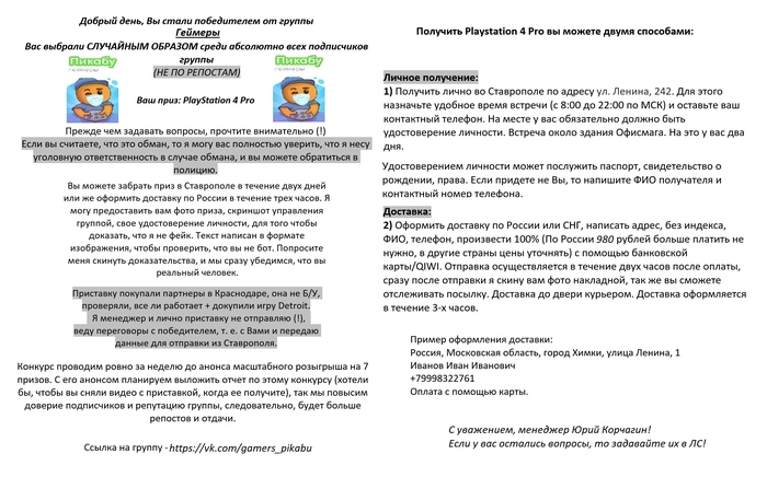 Написал мне Юрий, мол выиграл я Ps4, забирай. Я на полном серьезе не знаю развод это или нет, но на всякий случай такого просто избегаю. Поэтому без ответа.