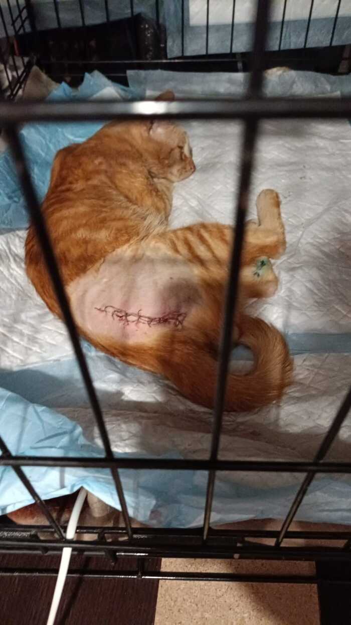 Молоденький, от силы месяцев восьми, рыжий несчастный кот под жутким проливным дождем был доставлен в клинику. Многочисленные переломы таза, гематома, травмы глаза и языка... Но внутренние органы не задеты! Хозяева на объявления не откликнулись.