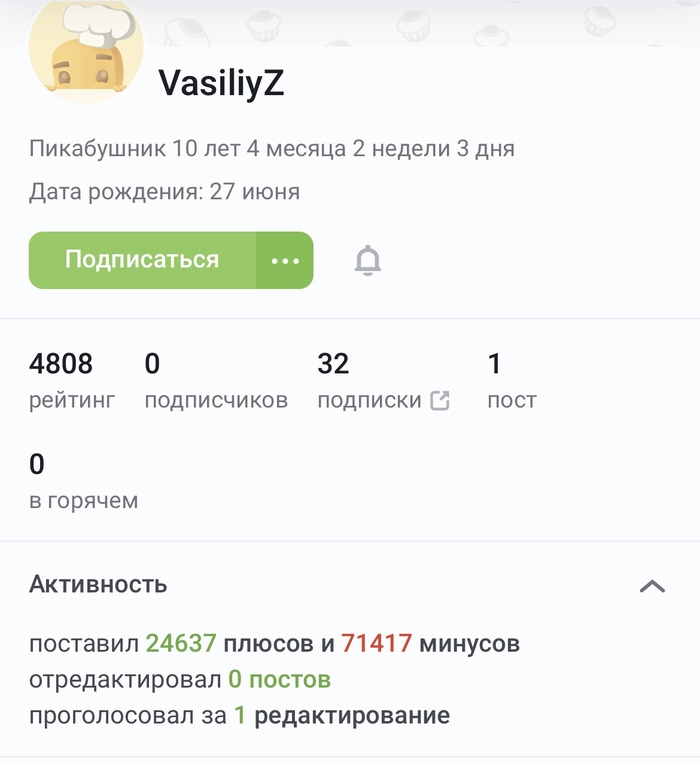VasiliyZ провёл на сайте 10 лет, 4 месяца, 2 недели и 3 дня, набрал рейтинг 4808, опубликовал всего 1 пост, подписался на 32 сообщества. Но главная «изюминка» — его активность в голосованиях: 24 637 плюсов и 71 417 минусов. Почти три дизлайка на каждый лайк — складывается впечатление, что цель аккаунта не общение, а систематическое «топление» чужих публикаций.