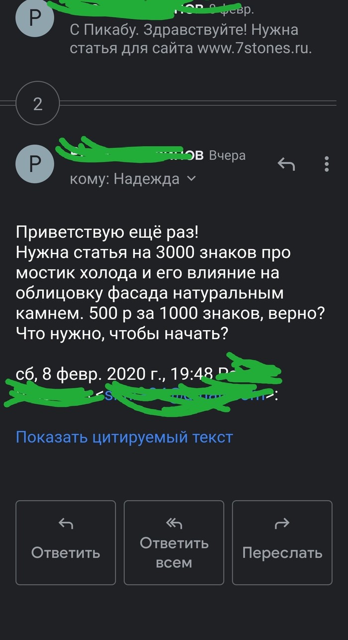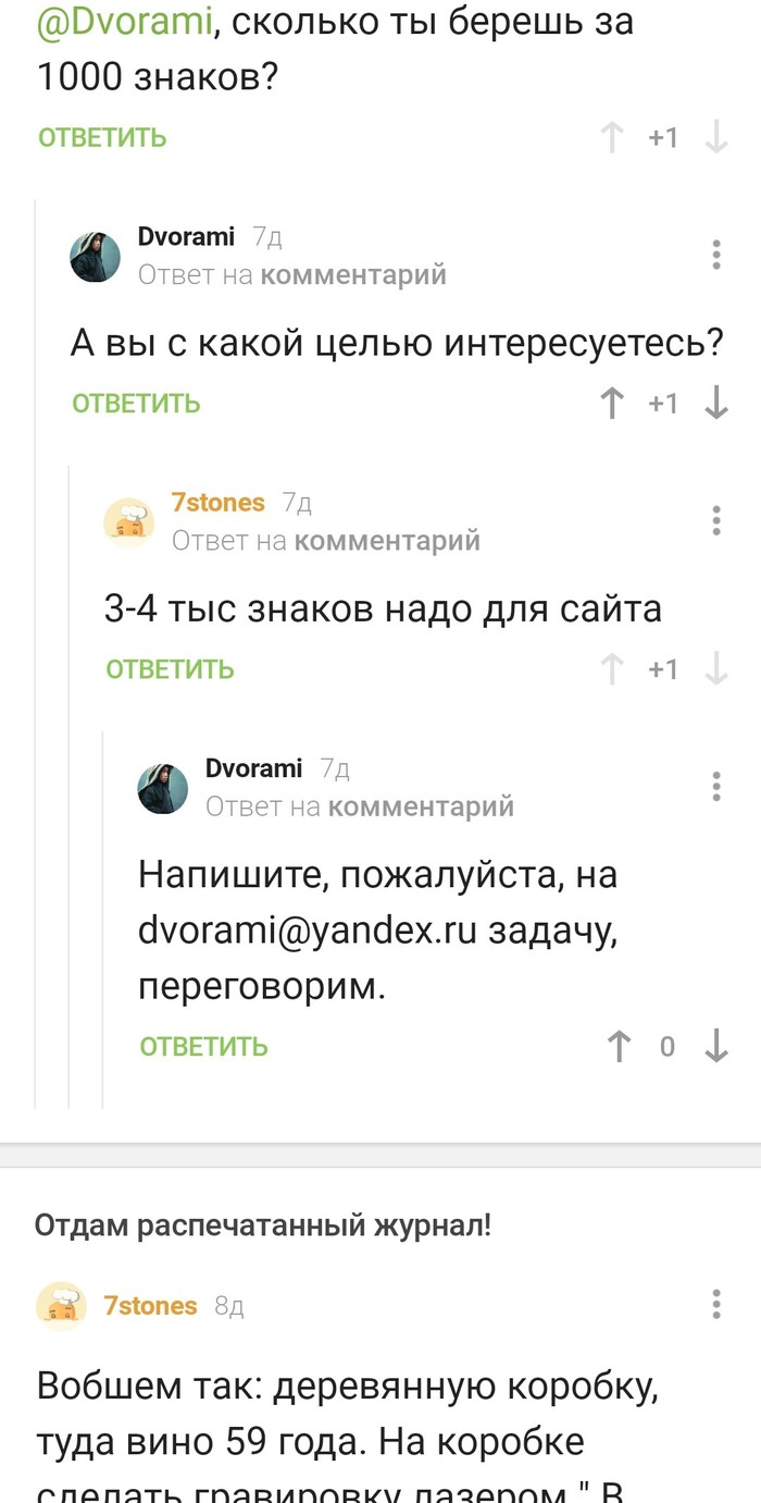 На Пикабу вылез юзер @Dvorami, и пишет , мол, он супер копирайтер. Отписался ему. Он скинул почту, куда писать: