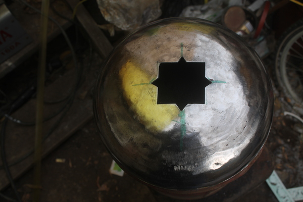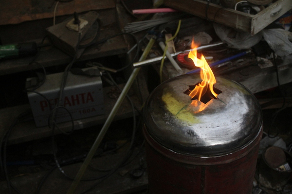 Значит первым делом находим газовый баллон, если новый, то сразу начинаем пилить, если же б\у, тогда следует провести некоторые процедуры чтобы не взорваться. Во-первых спускаем газ, это нужно делать вне помещения!!! Потому что его в некоторых баллонах может оставаться очень много. Затем нужно аккуратно отпилить ручки баллона, как на фото, далее простой ножовкой по металлу спиливаем вентиль, или выкручиваем его, но проще спилить, проверено, ибо туда его вкручивал либо Халк, либо суровые челябинские ребята.