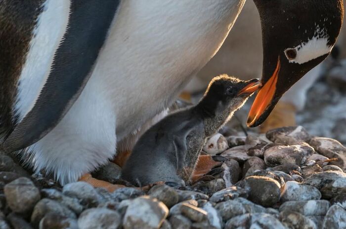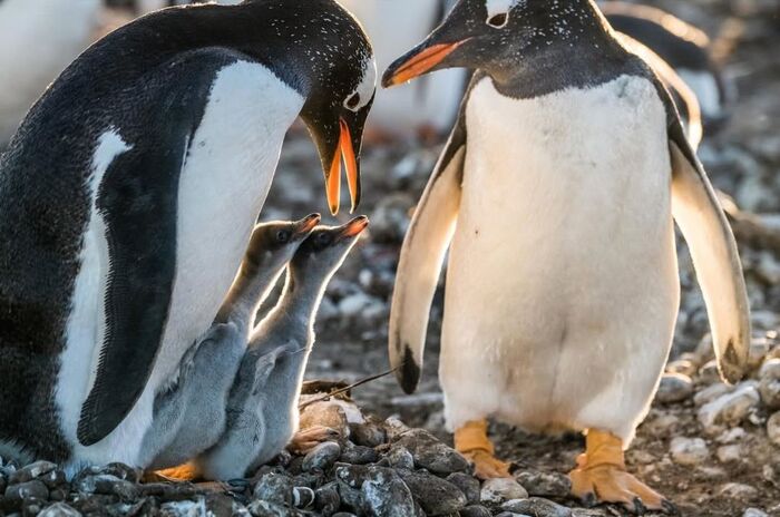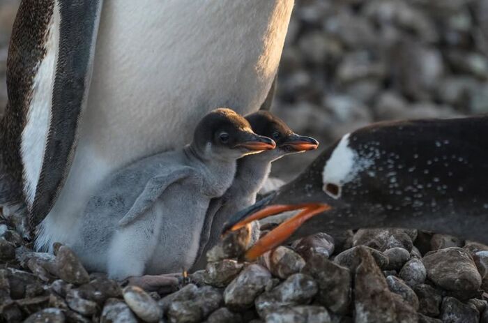 Это делают посменно: пока самец сидит, самка ест, и наоборот. В это время пингвину важно не прекращать жесты внимания и продолжать приносить камни. Это укрепляет и гнездо, и отношения.