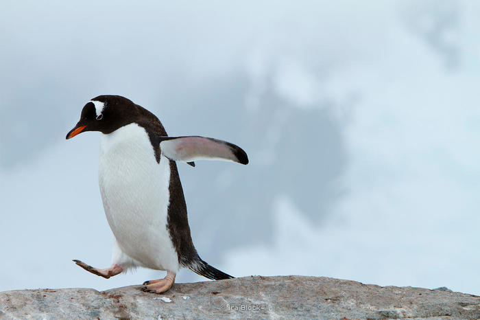 Тут всё — поза, взгляд, крылья врастопырку (будь человеком — сказали бы «пальцы веером!») — сигналит: имеется некая претензия к собратьям. А может, к режиму. Пингвино-федеративное устройство мы еще не изучали. А вдруг республика там у них? Узнаем, проверим, изучим.
