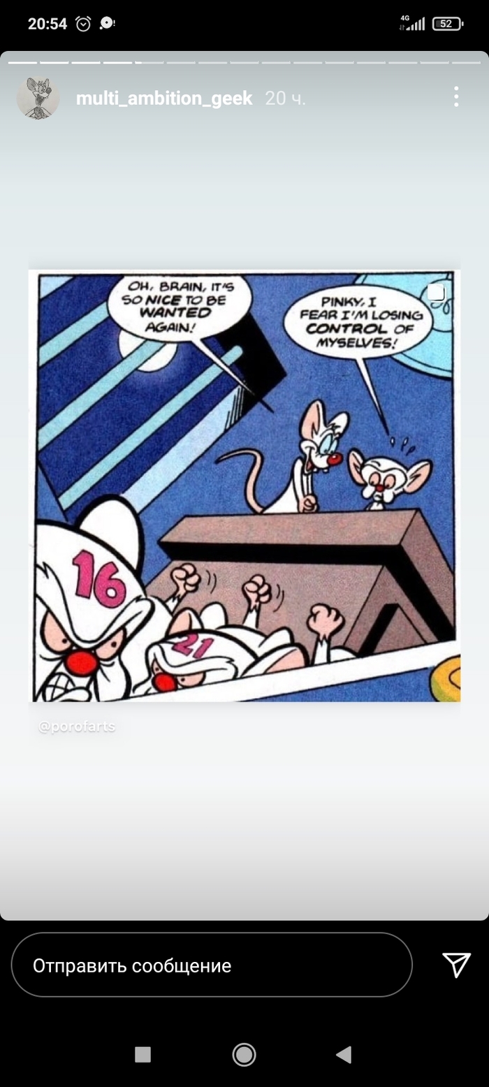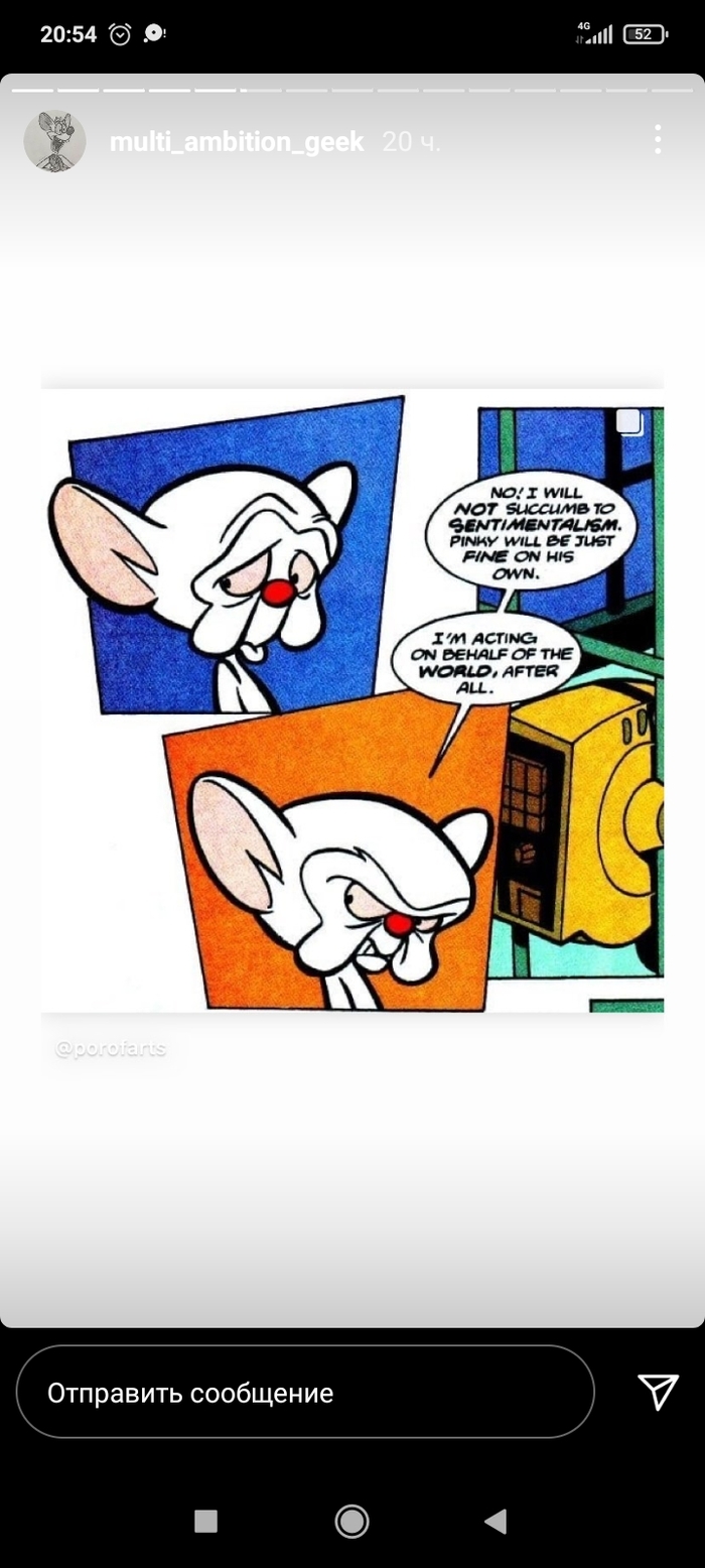 А что, если Пинки и Брейн пытаются захватить мир не из своих диктаторских/гитлеровских замашек, граничащих с фашизмом, экстремизмом и терроризмом в каком-то смысле, как принято считать, а чтобы прекратить страдания своих сородичей, подвергаемых жутким опытам в вивариях?!