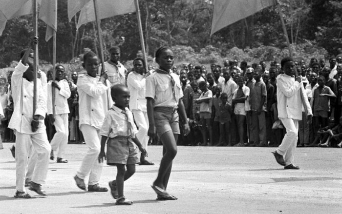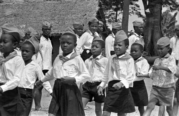Судя по найденным фотографиям, парадная форма у конголезских пионеров была довольно мажорная: белые штаны, белые длинные рубахи. Жарко же!..