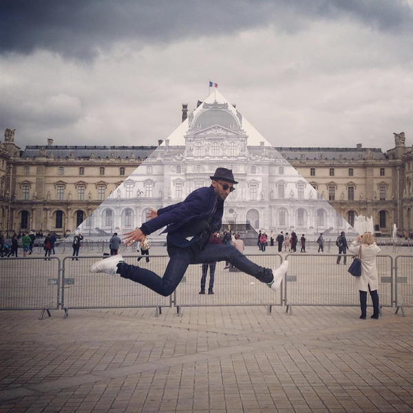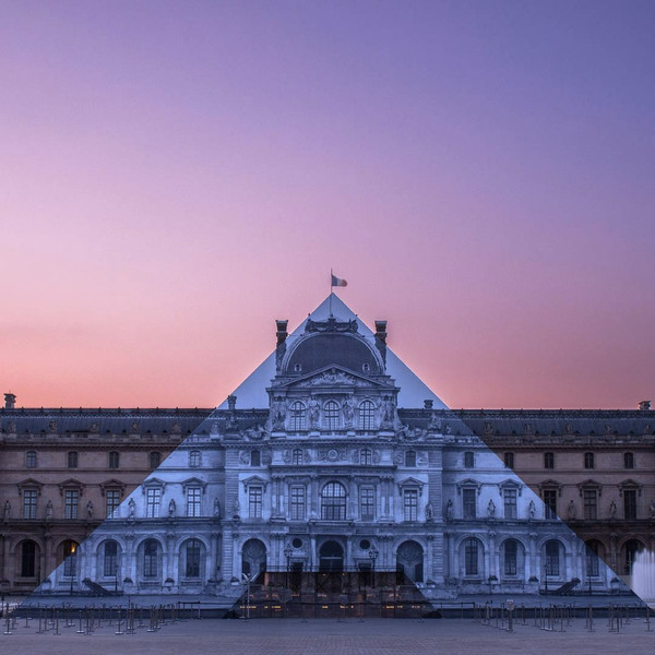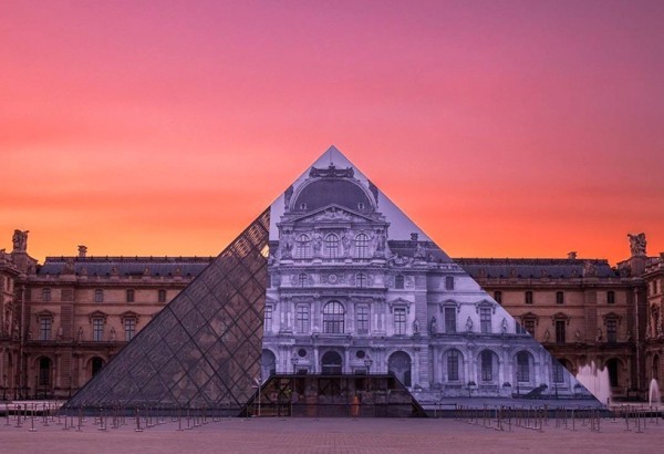 Главный вход в Лувр, знаменитую стеклянную пирамиду, оклеили историческим черно-белым изображением фасада музея. Если встать в определенную точку, то создается иллюзия, что пирамиды перед вами нет.