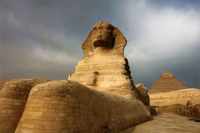 Визуально кажется почти такой же высокой, потому что стоит на возвышении. На вершине сохранилась часть полированной облицовки — так можно представить, как сияли эти сооружения в древности. Рядом стоит Великий Сфинкс — статуя с телом льва и лицом человека, высеченная из скалы. Считается, что она связана с фараоном Хафрой.