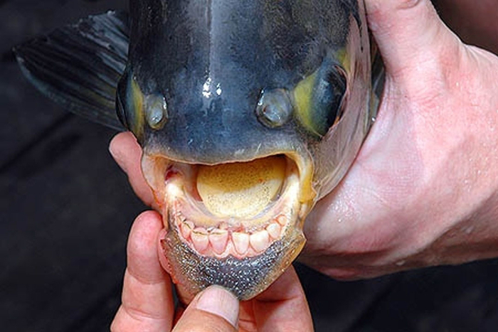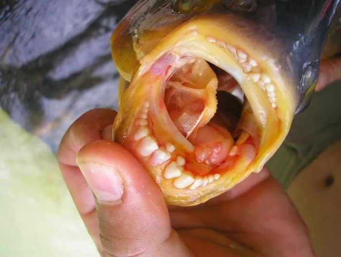 Рыба с "человеческими" зубами выглядит жутковато, но результатом мутации не является. Такие вот зубки нужны паку, чтобы перетирать растительную пищу (паку – растительноядная пиранья), есть которую сложнее животной, ведь она более твердая. Паку ест даже орехи.