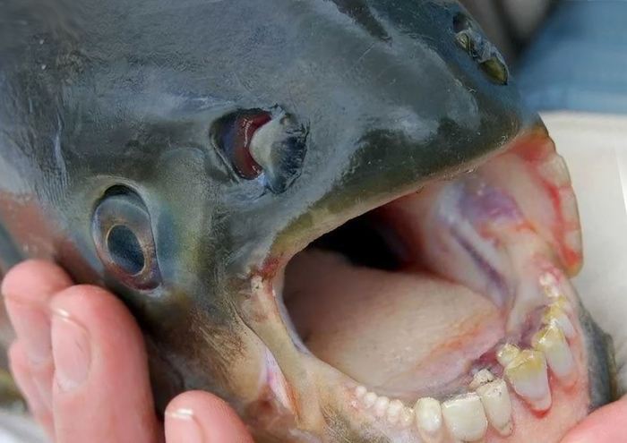 Впрочем, на крючки рыбакам порой попадают пираньи с зубами еще более страшными, чем в фильмах. Нижний ряд их зубов напоминает человеческий.