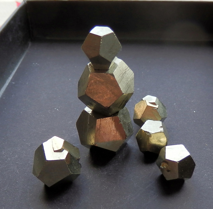 Пирит в кристаллографическом отношении является классическим минералом высшей – кубической – сингонии. Помимо характерных кубических кристаллов, ставших его своеобразной «визитной карточкой» в мире минералов, он часто образует пентагондодекаэдрические кристаллы (т.н. «пиритоэдры») или же комбинации простых форм куб-пентагондодекаэдр. Значительно реже образуются октаэдрические кристаллы, которые высоко ценятся коллекционерами. Совсем-совсем редко встречается хитрая комбинация его простых форм: октаэдра и пентагондодекаэдра, называемая «минеральный икосаэдр» из-за внешнего сходства с пятиосевой фигурой икосаэдром, которая является «запрещенной» в классической кристаллографии… См. ниже рисунок из "Курса минералогии" А.Г. Бетехтина