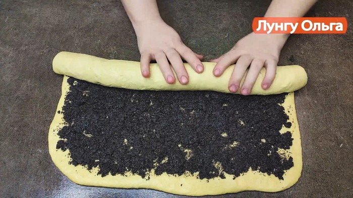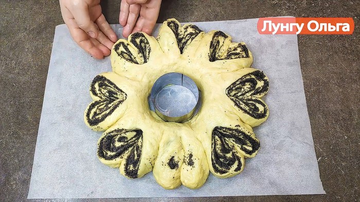 Стол смазываем сливочным или растительным маслом, выкладываем настоявшееся тесто и раскатываем в прямоугольный пласт, толщиной примерно 0.5 см. Выкладываем маковую начинку и равномерно распределяем по всему тесту, после чего сворачиваем в рулет и перекладываем на пергаментную бумагу. по центру выставляем любую окружность и сворачиваем в кольцо, защипываем края.