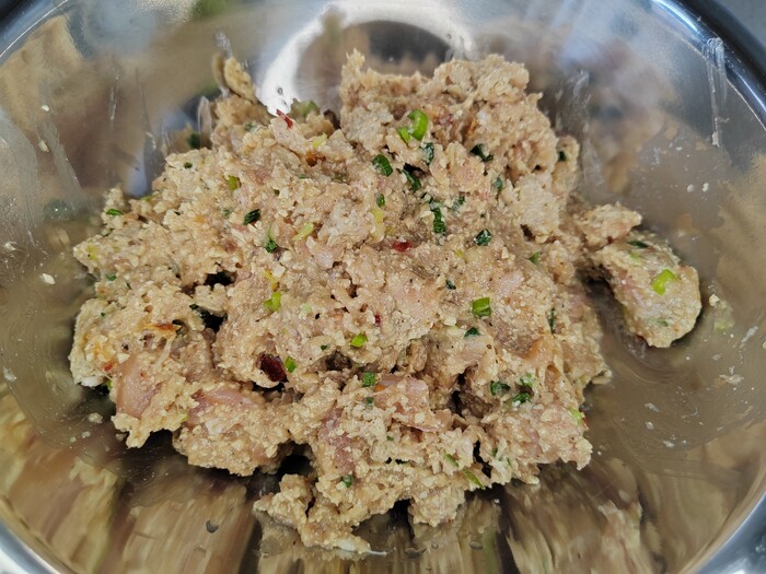 9. На плиту сковороду/вок, в сковороду масло, в горячее масло фарш. И обжариваем/обтушиваем.