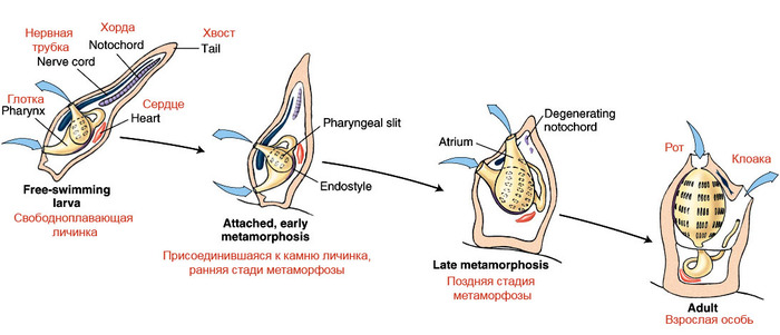 Асцидии сидячие животные, они могут жить поодиночке или кучей. Прикрепившись к поверхности, личинка асцидии деградирует: хвост вместе с хордой постепенно исчезает, тело принимает мешковидную форму, статоцист (орган слуха и равновесия) и глаз тоже исчезают, а вместо мозгового пузырька остается только нервный ганглий и околонервная железка.