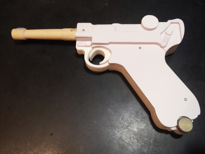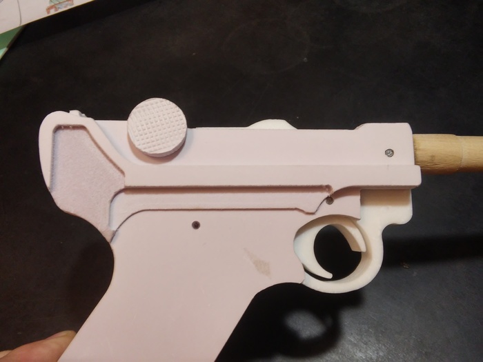 Самое сложное в поделке из дерева - затвор. Нужно избегать больших щелей между рамкой и главным механизмом, в то же время добиться безперебойного движения без лишнего трения, которое после покраски может вообще всё испортить. Также затвор своей передней частью должен свободно проходить через ствол и внутреннюю выемку рамки.