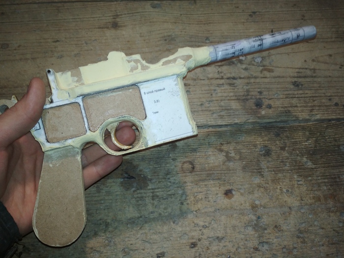 Самоделка состоит из слоёв МДФ, выпиленных электролобзиком, переплётного картона и бумаги. Чтобы уместить все механизмы, пришлось пожертвовать правильной шириной Беретты. Мой макет получился несколько толще.