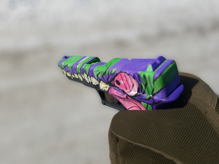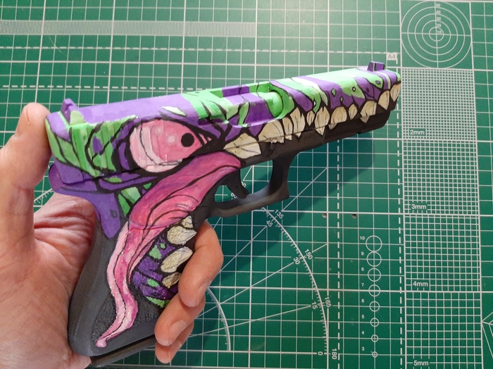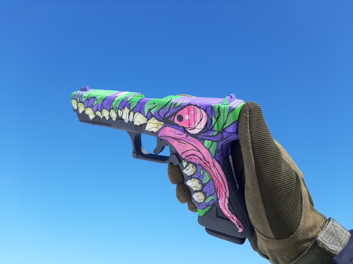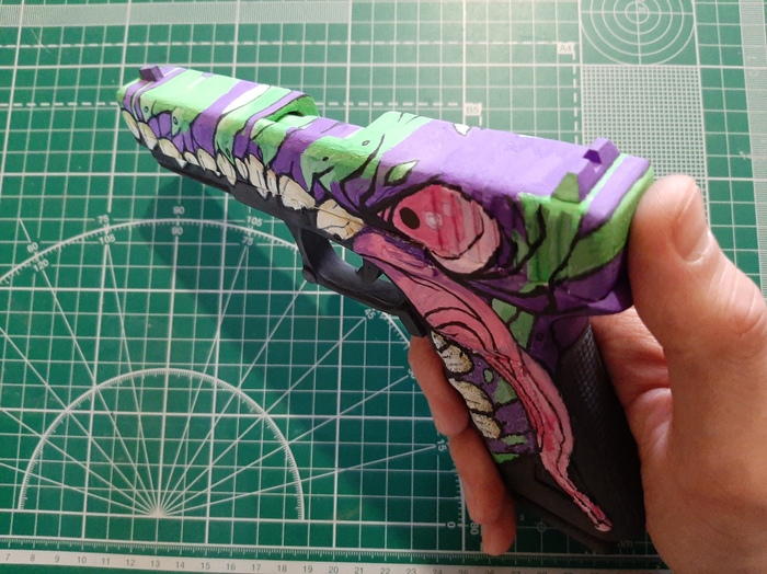 А дальше самое сложное - сам рисунок, ну или скин, как обычно называют всякие принты на оружии в играх. Использовал обычную гуашь разных цветов, кстати скин называется "Монстр", ну по изображению понятно:)