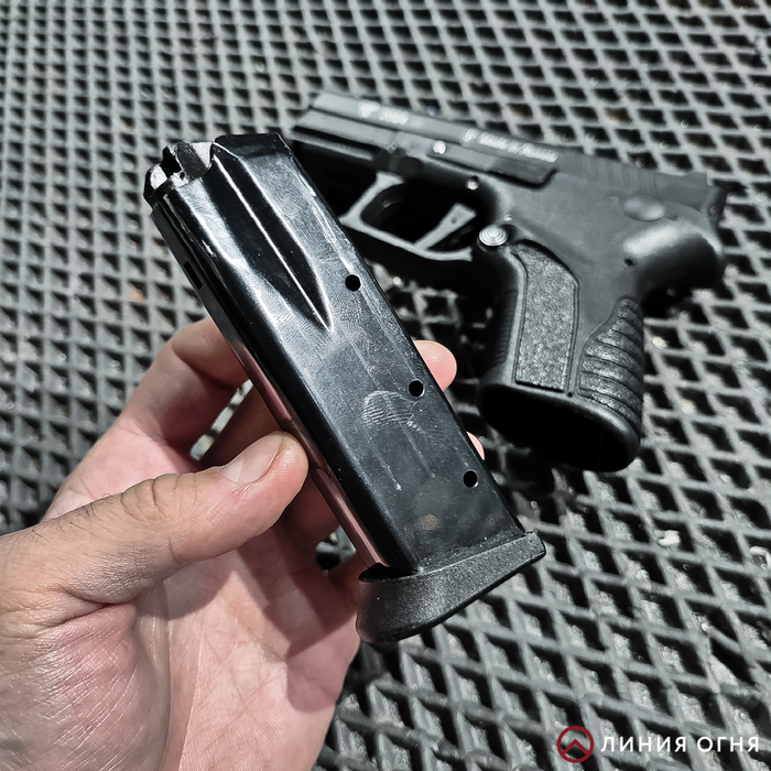 Магазин здесь на 10 мест. Внутри стоит ограничитель. Если бы не законодательные ограничения, то помещалось бы 12 патронов. Сюда подходят и магазины увеличенной ёмкости. При использовании магазина от Grand Power T12 или TQ2 можно воспользоваться проставкой. Так и эргономика улучшается.
