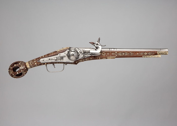 1. Кремневый пистоль из Шотландии. Сталь, серебро, кожа и дерево, 1730–1740 гг, длина 31 см, калибр 13 мм.