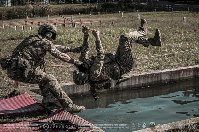 Водные процедуры являются неотъемлемой частью соревнований ВЕЧНО ЖИВЫЕ. Важно было сделать упражнения такими, чтобы они напоминали реальные условия, которые могут включать в себя пересечение водных препятствий (водоемы). Один участник прокладывает путь, протягивая трос над водой, а остальные, с помощью карабина, продвигаются по тросу, со всем снаряжением.
