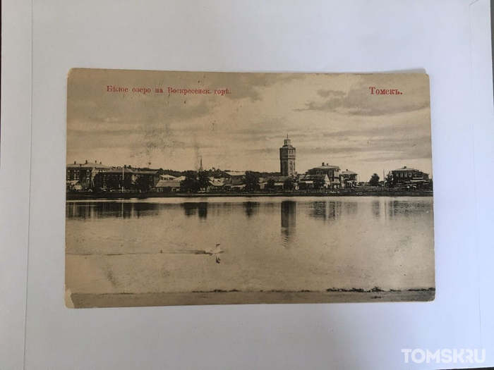 «Озеро в старом городе, на горе, занимает целый квартал; имеет форму овальную, длинна 80 саж и ширина 70-75 с.; огорожено, по берегу растут деревья и поставлены скамейки. Вода чистая, т.к. запрещено пасти скот и мыть белье. За озером – кладбище в громадной березовой роще; высокое здание – водонапорная башня», – такая подпись находится на открытке, где изображено Белое озеро.