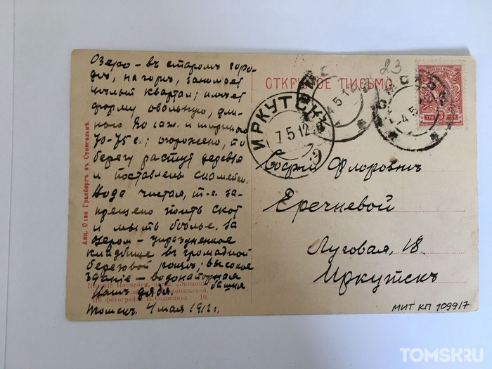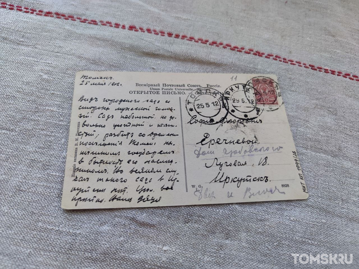 В 1912 году ревизор Владимир Еречнев отправил своей жене Софье, которая в это время находилась в Иркутске, 65 открыток с видами Томска и краткими описаниями того, что на них изображено. Зачем ревизор приехал в Томск, куда потом отправился, и как сложилась его судьба – неизвестно. Коллекция открыток хранится теперь в архивах Музея истории Томска. Приглашаем вас мысленно перенестись во времена Российской империи, читая описания города от заезжего человека.