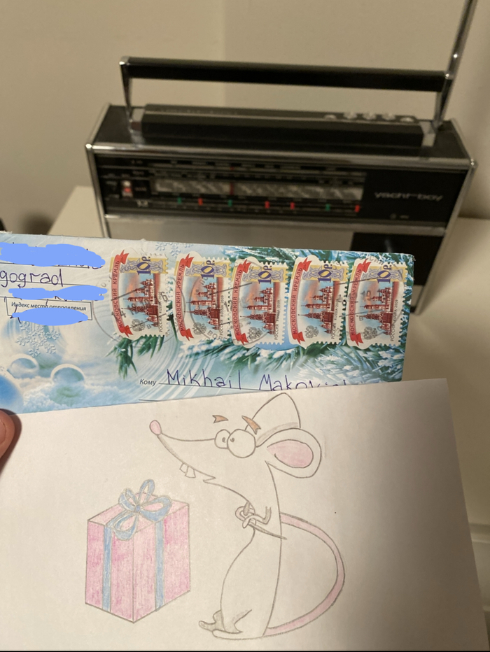 Новогодняя открытка неизвестной даты, видно только число 29 – почтальон успел ее донести до Нового года, но вручить не получилось – закинул второпях за ящик. Ее тоже знатно поточили жучки.