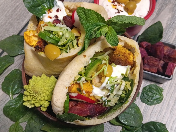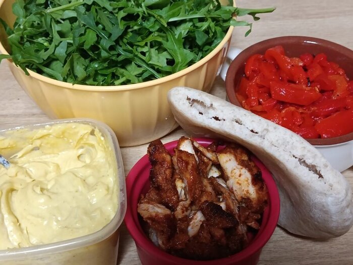 Пита - салат - куски вырезки - соус.